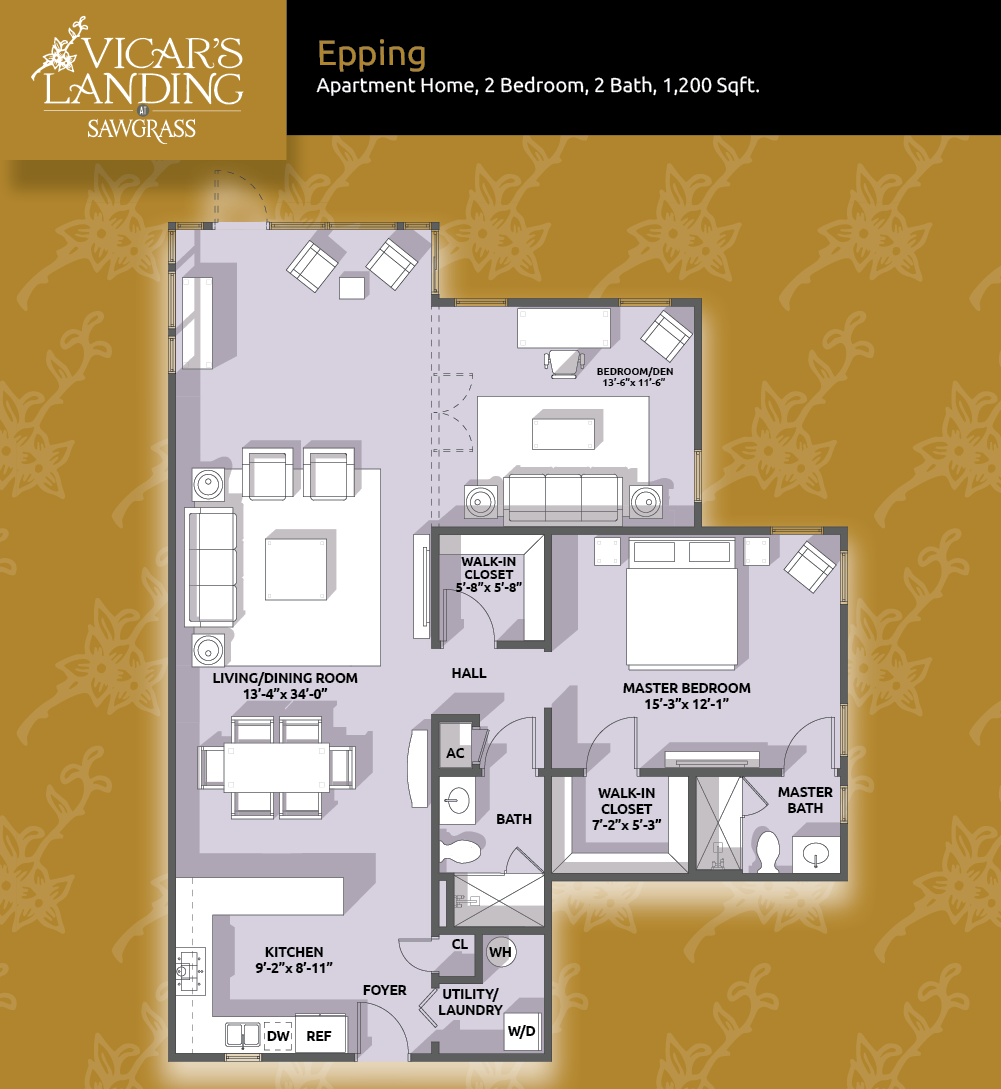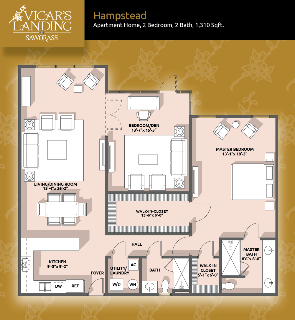 A two-bedroom, two-bathroom Apartment Home, Epping combines a comfortable floor plan with plenty of room to welcome house guests. At 1,200 square feet, the Epping includes a sunroom and a spacious master bedroom with walk-in closet and bath. You’ll be pleased, and your guests will be impressed.Hampstead