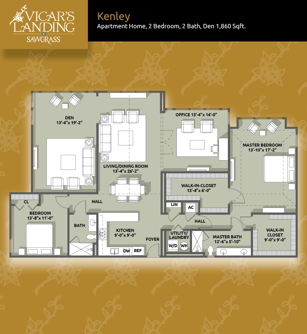 The largest of our six Apartment Homes, Kenley’s 1,860-square-foot floor plan features two bedrooms, two full bathrooms, a den or optional third bedroom, dual sunrooms, separate dining room, and more. Enjoy a spacious master suite with walk-in closet, linen closet, and dressing area, with windows overlooking the beautiful Vicar’s Landing campus.Regent