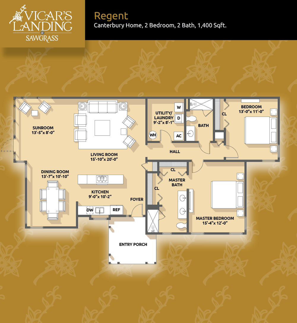 This is living! At 1,400 square feet, our two-bedroom, two-bathroom Regent Canterbury Home offers a stand-alone house with all the benefits of Vicar’s Landing just outside your door. Regent’s floor plan features a separate entry porch, spacious living room, separate dining room, sunroom, and plenty of storage space. If having a separate home and still feeling like part of a great community is what you’re looking for, this could be the perfect fit.Wickham
