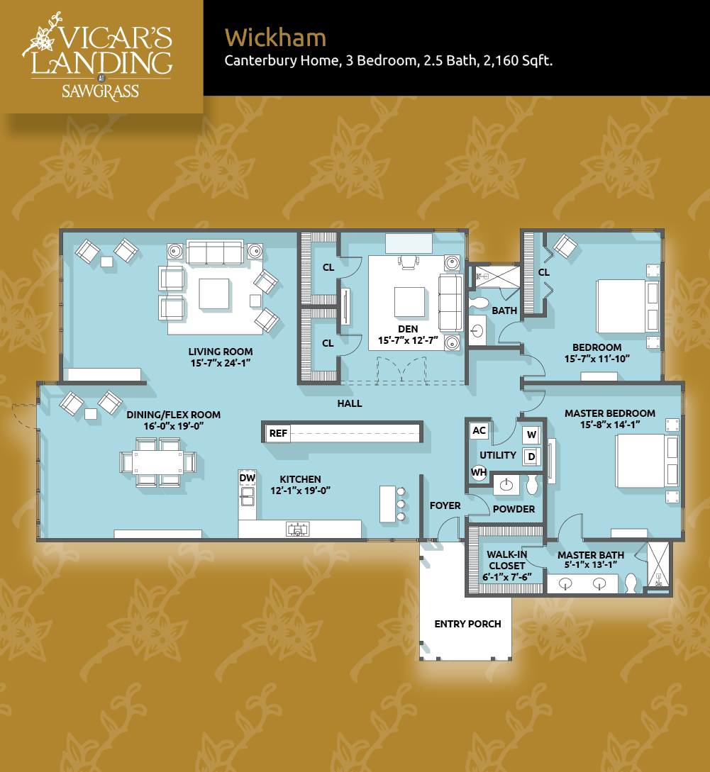 Our most spacious option, our Wickham Canterbury Home, is 2,160 square feet, and you’ll love every last inch. Perfect for the resident who loves entertaining overnight guests, Wickham boasts a three-bedroom, two-and-a-half-bathroom floor plan. The plan also features an entry porch, sunroom, grand foyer, breakfast nook, utility room, and plenty of storage space. If you’re looking to retire in grand style, welcome home!